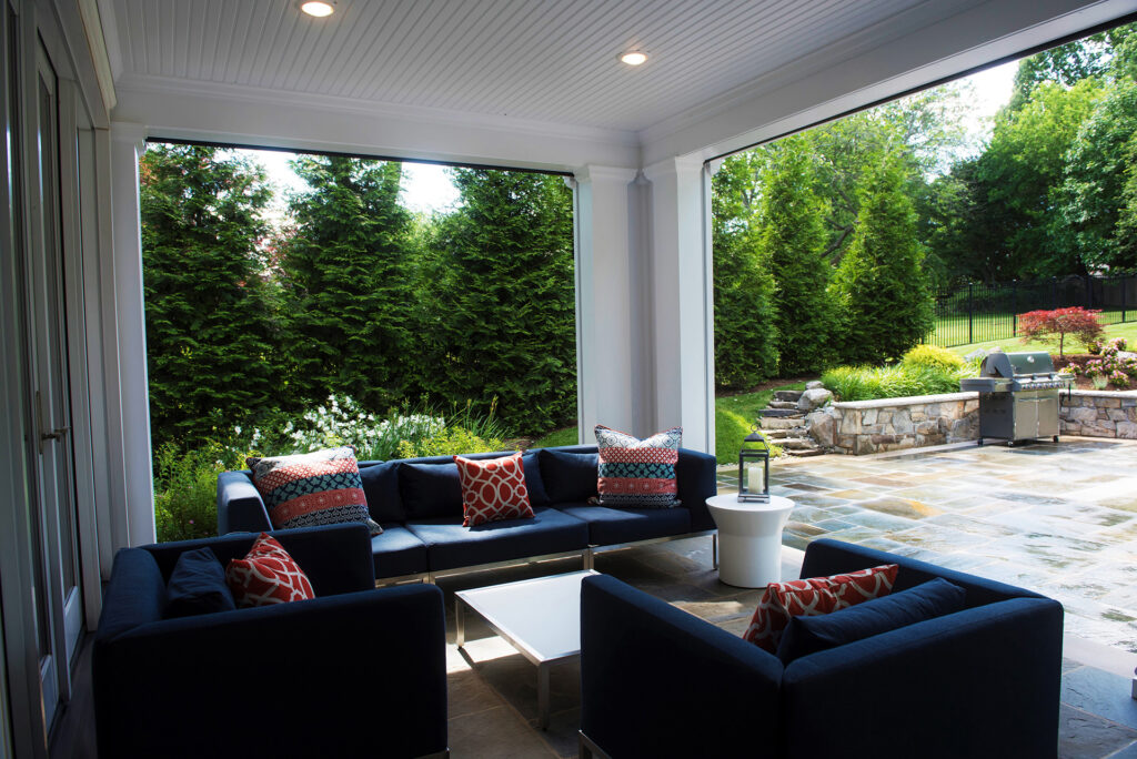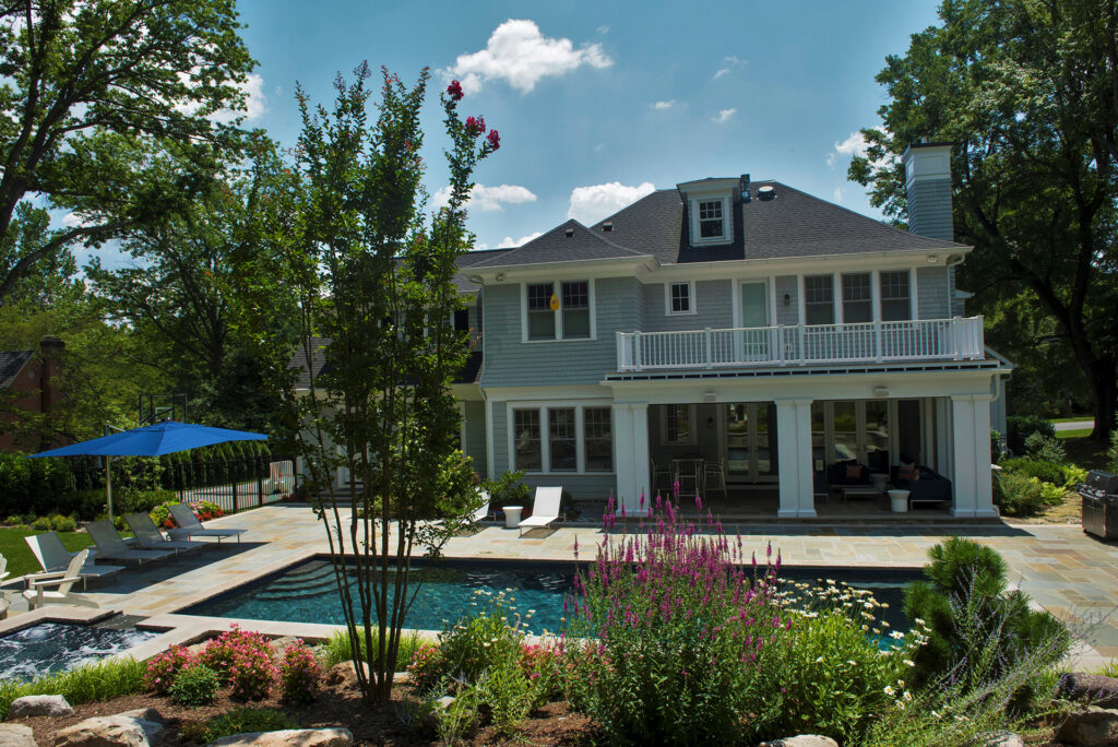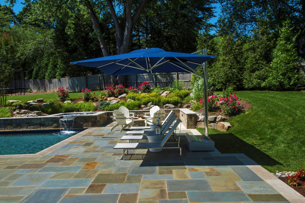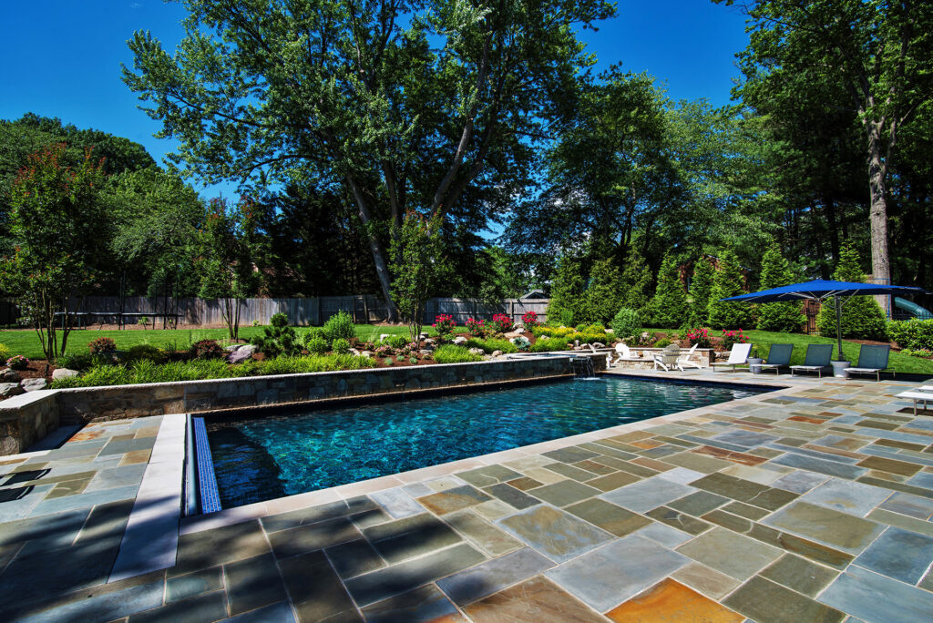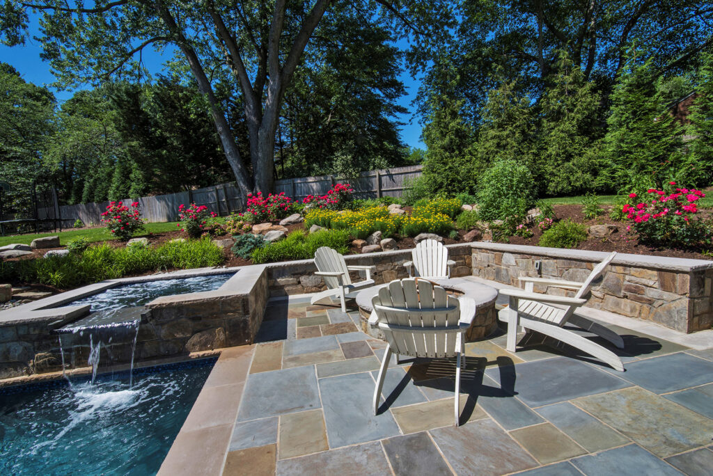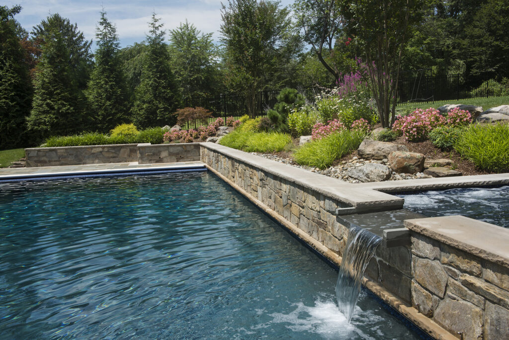 We set the elevated spa with a waterfall behind the pool and faced it with natural stone veneer . We continued this natural stone along a retaining wall that holds back the grade above the pool.. For the pool decking, we chose rectangular flagstone with a limestone border to match stone features in the sun room and on the house. A stone fire pit with limestone coping is situated close to the spa so the family could enjoy an evening fire and s’mores.