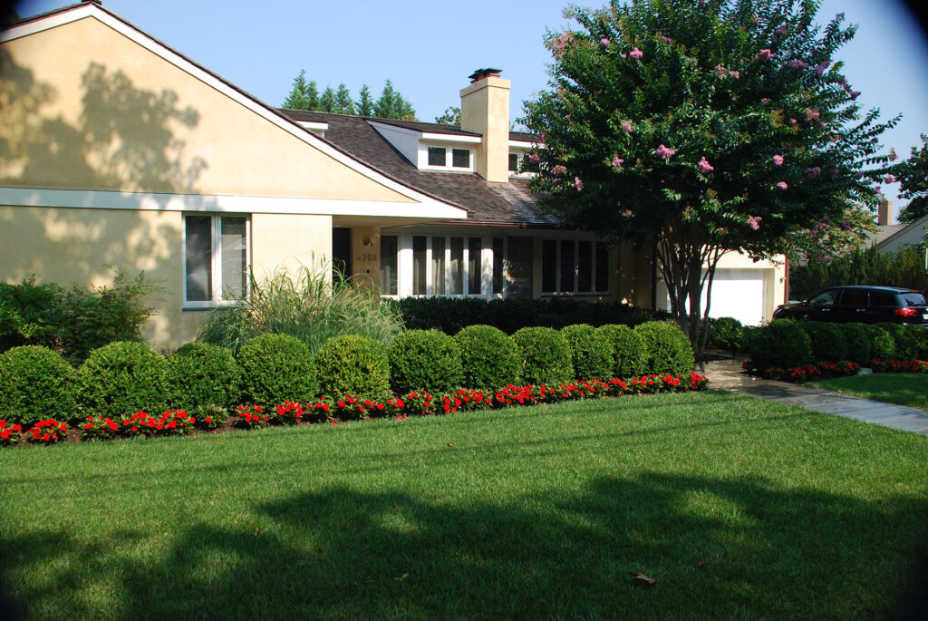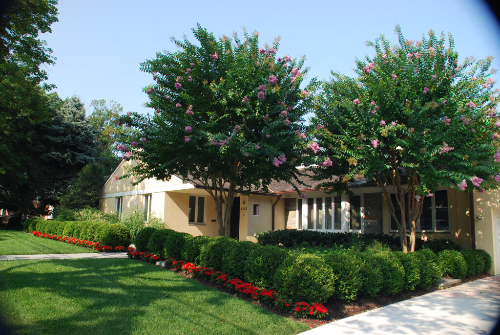 The front planting includes two gorgeous crape myrtle, winter gem boxwood, and hypericum.