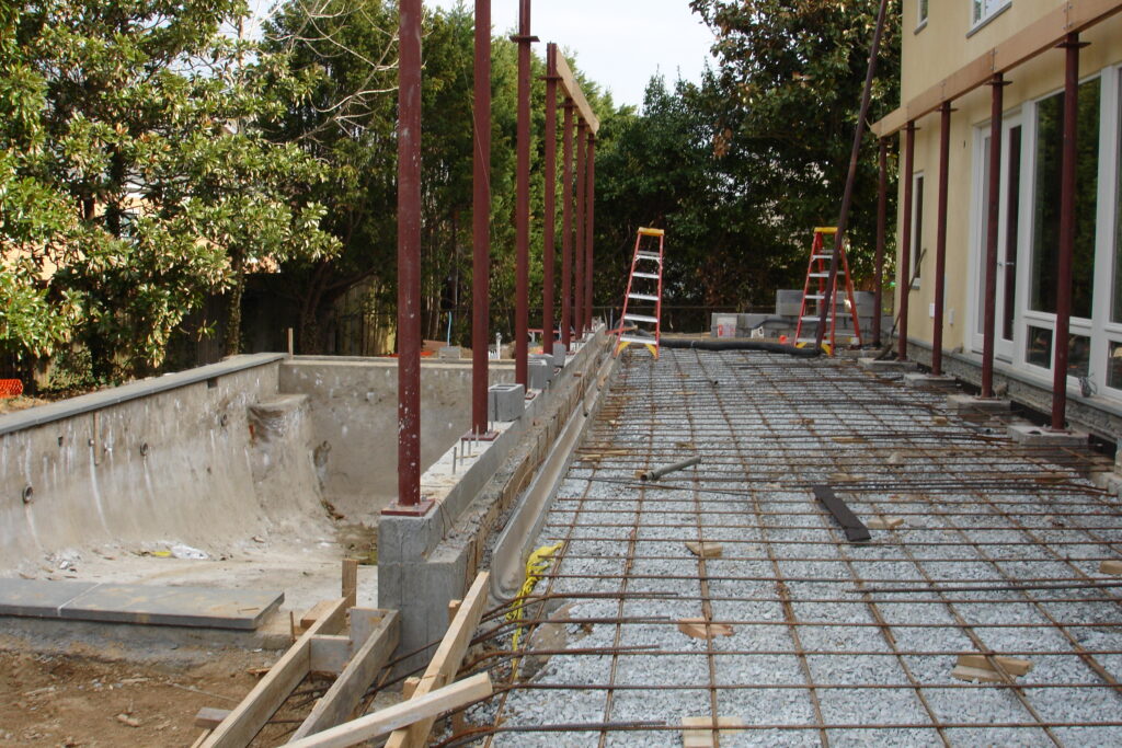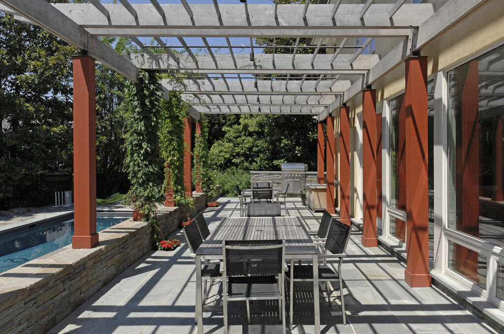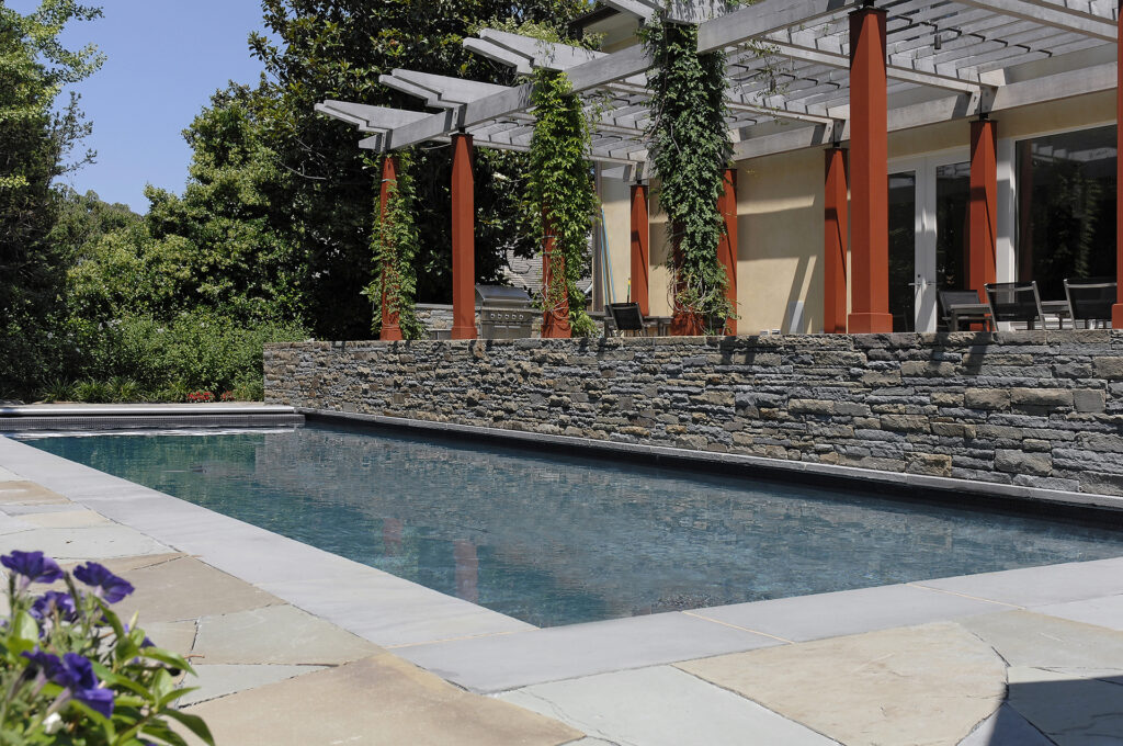 The centerpiece of the back yard is the swimming pool area which features natural flagstone wall set on the pool beam, and the beautifully designed and constructed arbor. The support for the arbor was an extensive steel beam structure set into the pool concrete beam and into large reinforced concrete footings. We used the highest grade cedar for the solid 6 by 12 beams, 4 by 10 joists, and a facia wrap around the steel beams. Copper piping stabilized the rafters and provided an interesting final touch.